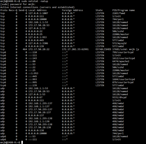 <li> Use the '''sudo ps aux''' command (along with '''grep''') to match the PID (process ID) numbers of open ports shown in '''netstat -natup''' with specific processes on your system.</li> | <li> Use the '''sudo ps aux''' command (along with '''grep''') to match the PID (process ID) numbers of open ports shown in '''netstat -natup''' with specific processes on your system.</li> | ||