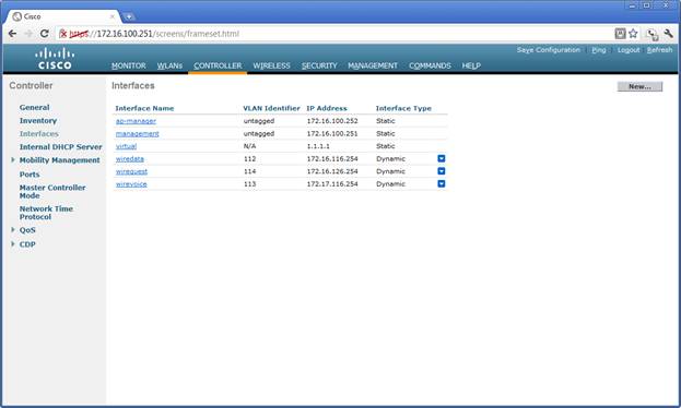 VLAN Interfaces. Each vlan is assigned an interface and an address. This is done through the “Controller interfaces” page. In the example, below, the interfaces are named wiredata, wireguest, wirevoice and have addresses, 172.16.116.254, 172.16.126.254, and 172.17.116.254, respectively.