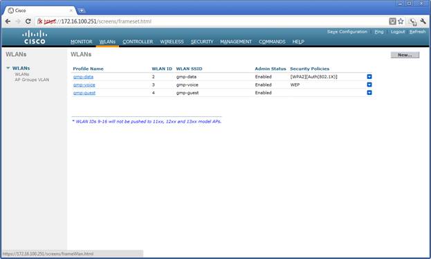Wireless Profiles/SSIDs. Wireless profiles define the characteristics of the wireless SSID. The following image shows the creation page for a new SSID. The WLAN ID is a unique identifier within the controller. The profile name and SSID are text strings..